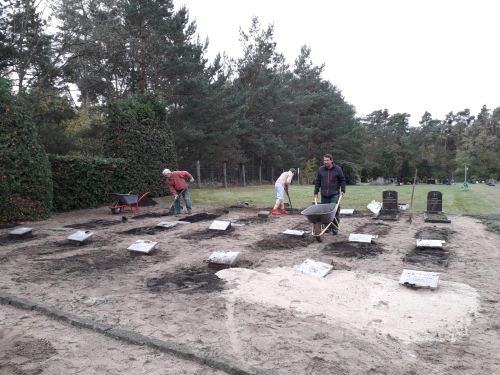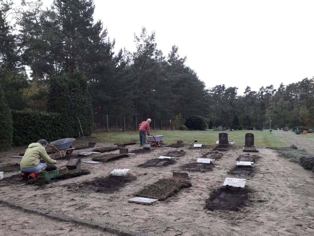 Vor dem Allerseelentag hat unser Gartenteam mit freiwilligen Helfern den Bereich der Schwesterngräber auf dem Kummersdorfer Friedhof grundlegend neu gestaltet. Damit soll der erhebliche Zeitaufwand für die Grabpflege reduziert werden. Außerdem wurden an jeder Grabstelle Stauden gepflanzt, die dem märkischen Sandboden – hoffentlich – gewachsen sind.