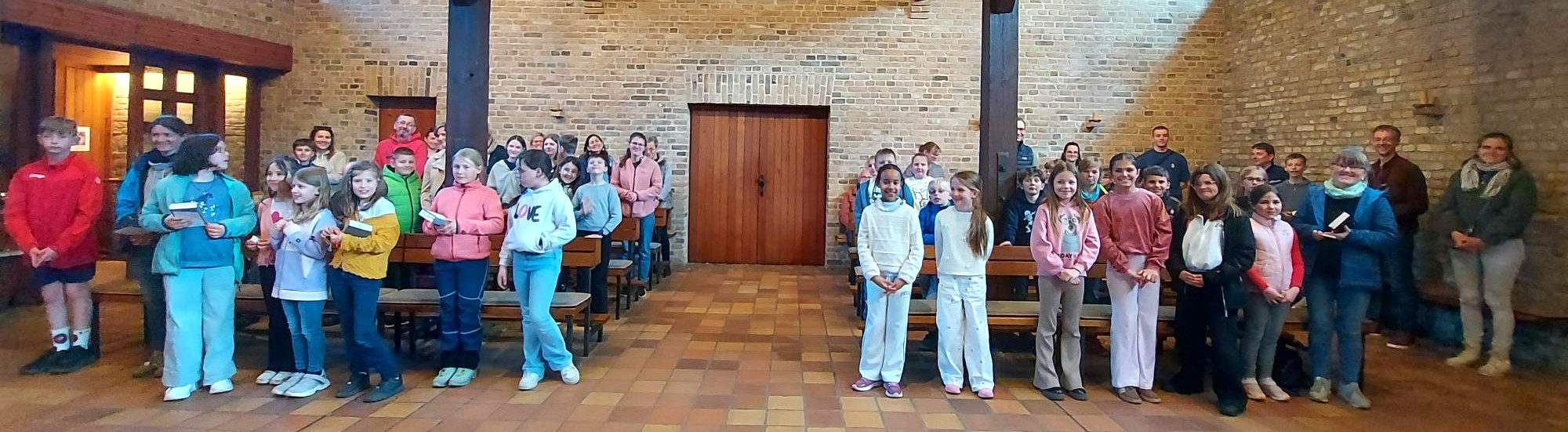 Zeitgleich waren die Erstkommunionkinder unserer Pfarrei St. Benedikt mit Betreuern und Eltern zu Gast. Sie lernten das Kloster mit kleinen Workshops im Tagesraum, Kirche und Hostienbäckerei kennen. Zur deutschen Vesper war die Kirche gut gefüllt mit kleinen und großen Gästen.